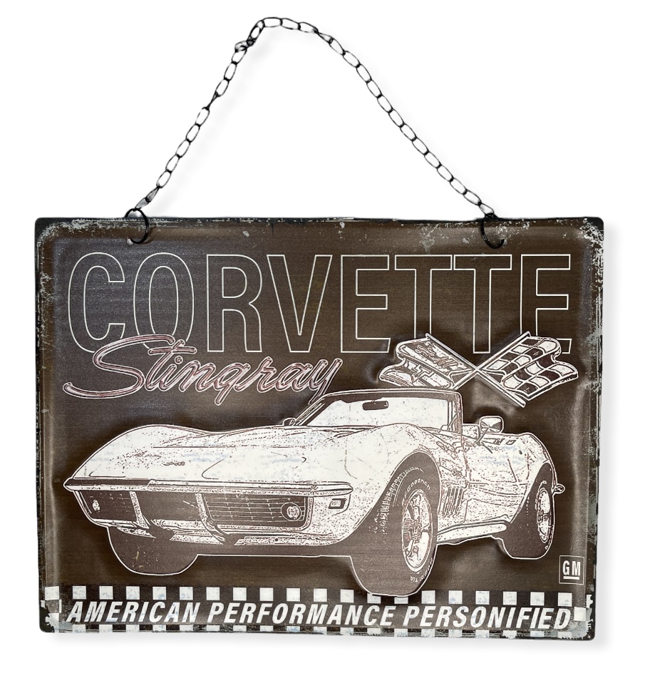 Peltikyltti ketjulla, Corvette Stingray. Mitat 40 cm x 30 cm. Vaakasuoranmallinen tyylikäs kyltti, mustalla ketjulla..