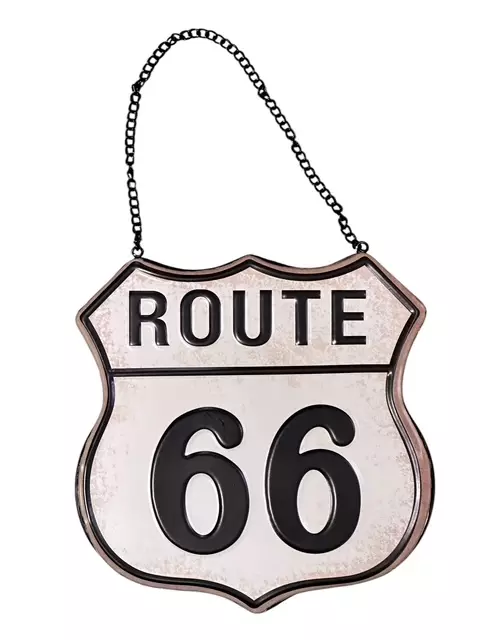 Peltikyltti ketjulla, Route 66 valkoisella taustalla. Kolmiulotteinen peltikyltti, vaakunanmallinen. Mitat 25 x 25 x 2,2 cm.