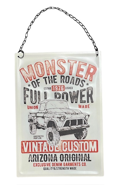 Peltikyltti Monster of The Roads, 28 x 40 cm. Musta ketju ripustamista varten.