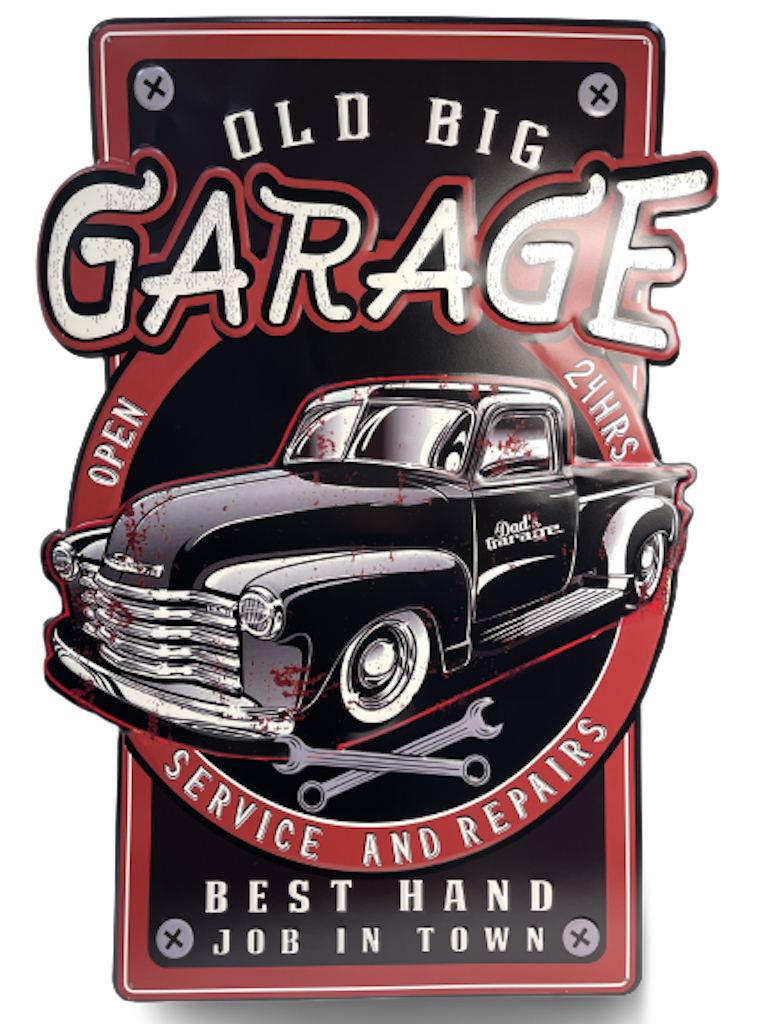 Peltikyltti GARAGE old big open 24 hour. MUSTA pick up. Kylttiä saatavana myös punaisella pick up:lla (PELT250)