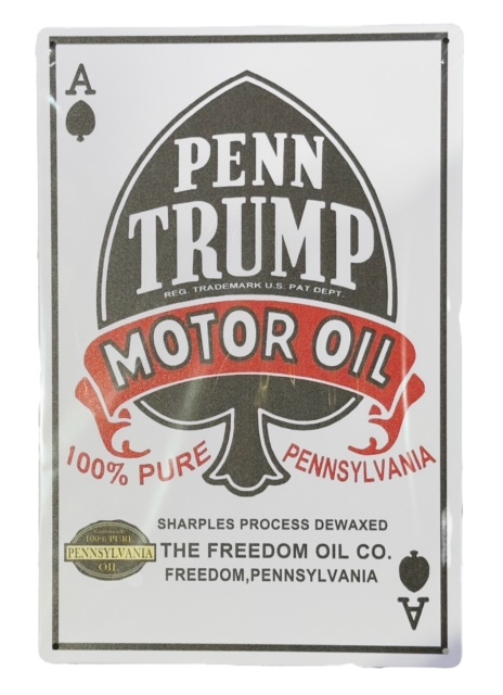 Peltikyltti Penn Trump Motor Oil. Mitat 20 x 30 cm. Kulmissa pienet reiät ruuveille tai narulle ripustamista varten. Kiinnitystarvikkeet eivät sisälly pakkaukseen.