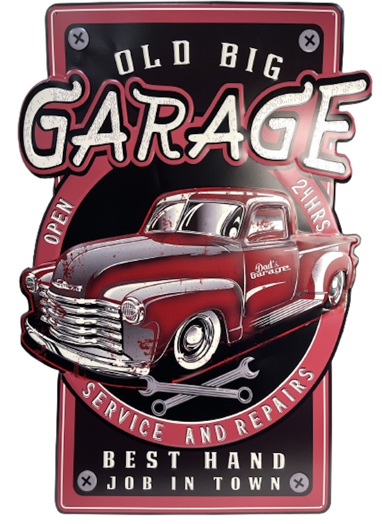 Peltikyltti GARAGE old big open 24 hour. PUNAINEN pick up. Kylttiä saatavana myös mustalla pick up:lla (PELT251)