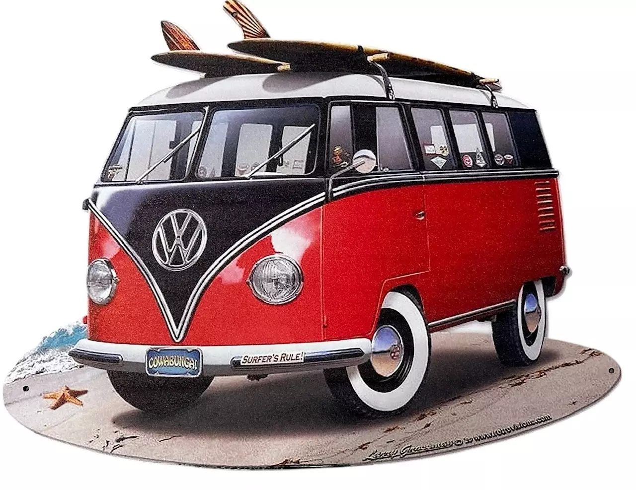Peltikyltti VW Kleinbus. Peltikyltti 40 x 32 cm. Kyltissä kolme reikää ripustusta varten.