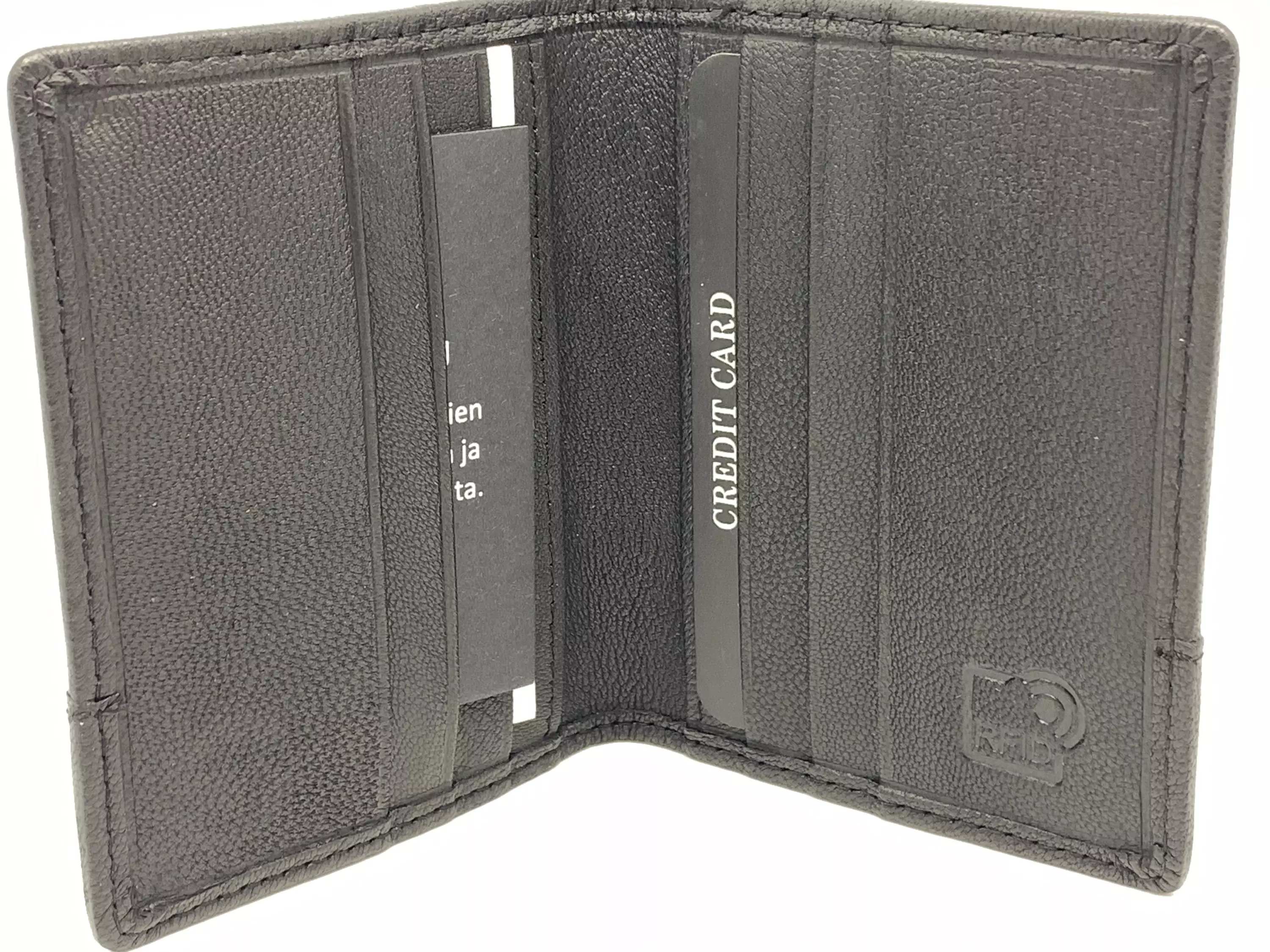 Pieni nahkalompakko, RFID suojattu. Musta RFID-suojattu nahkalompakko kahdeksalle kortille. Aitoa nahkaa. Mitat n. 7,5 x 10 cm.RFID-suojaus estää korttien laittoman skannauksen ja on suojattu radioaalloilta. Kortti on suojassa kun lompakko on kiinni. Lompakossa suojakalvo on lompakon nahan sisällä.