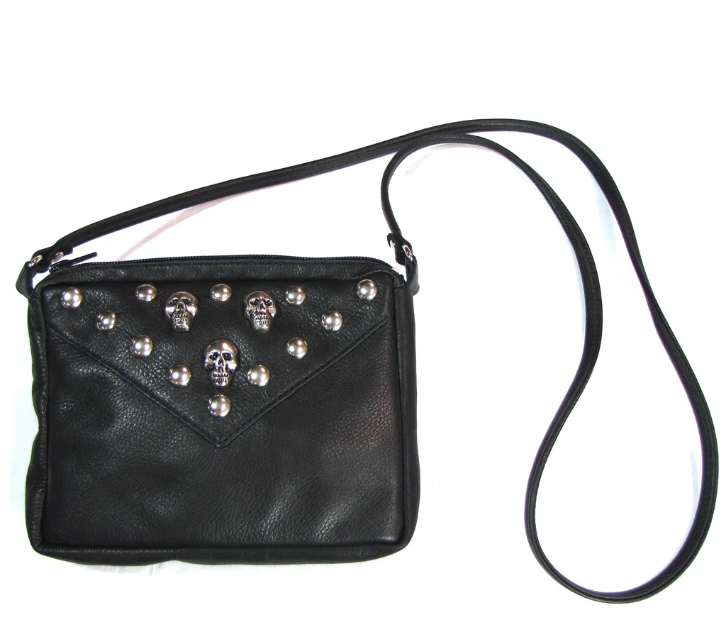 Pieni vetoketjullinen olkalaukku niiteillä, musta. Nahkainen pieni olkalaukku, jossa on krominväriset koristeniitit, kolme pääkalloniittiä ja 12 pyöreää niittiä. Laukun mitat 185 cm x 160 cm x 30 cm.