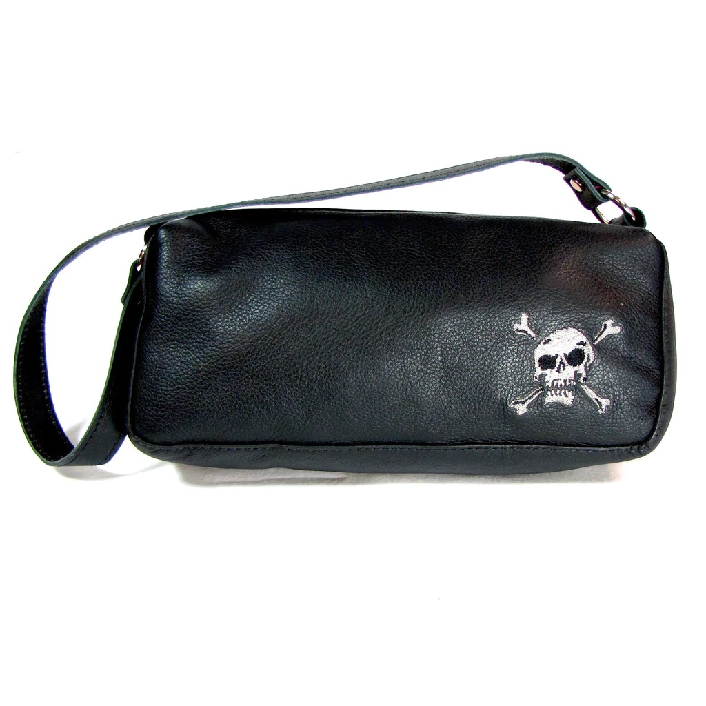 Pieni vetoketjullinen olkalaukku pääkallobrodella, musta nahka. Laukun sisällä vetoketjullinen tasku pikkutavaroille. Laukun mitat 26 cm x 15 cm x 7 cm.
