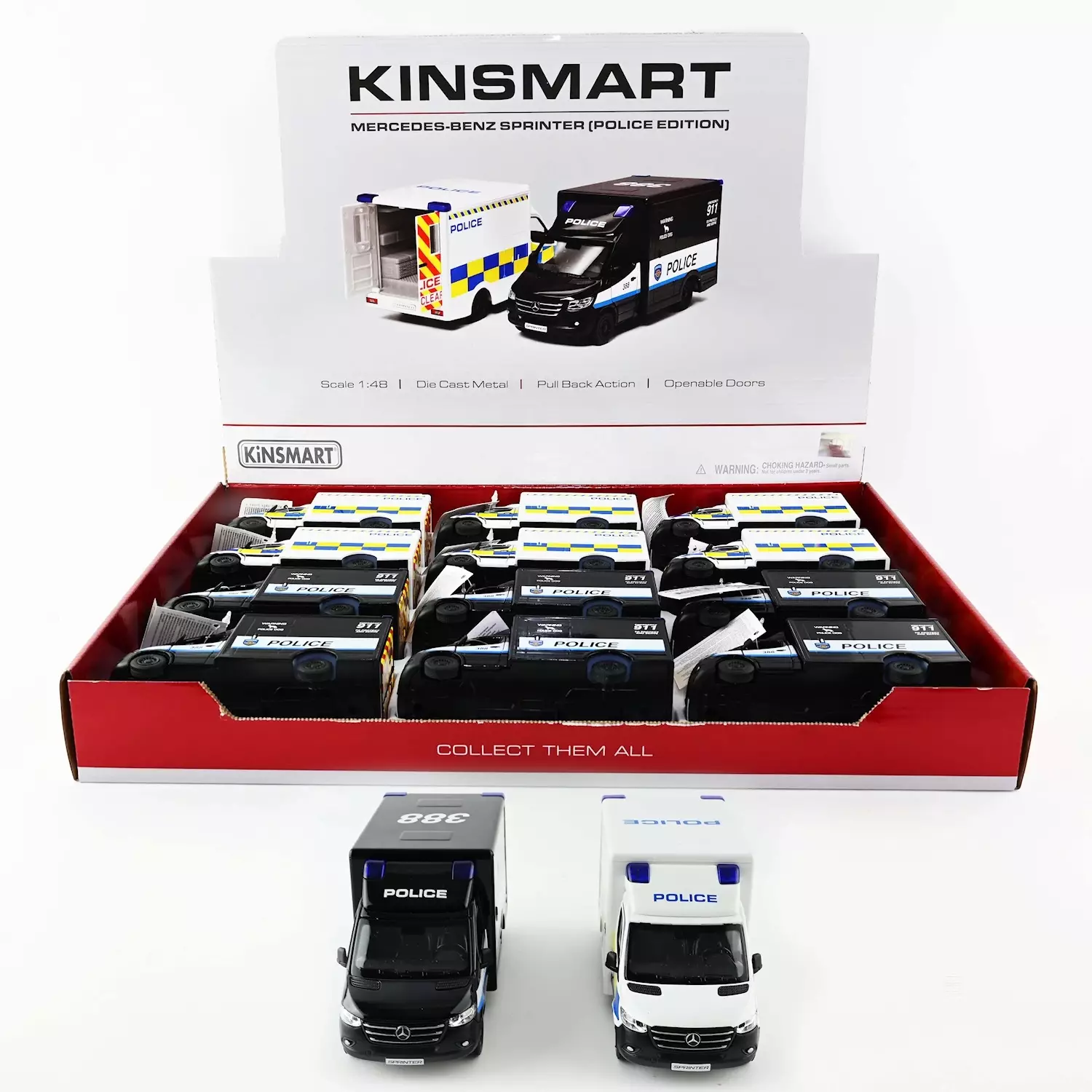 Pienoismalli Poliisiauto 1:48, 13 cm. Kaksi eriväristä poliisiautomallia PullBack-toiminnolla (vedä taaksepäin ja auton saa liikkeelle). Molemmissa malleissa aukeavat ovet ja takaluukut. Mustassa mallissa myös varoitusteksti poliisikoirasta. Ikäsuositus 3+, sisältää pieniä osia !