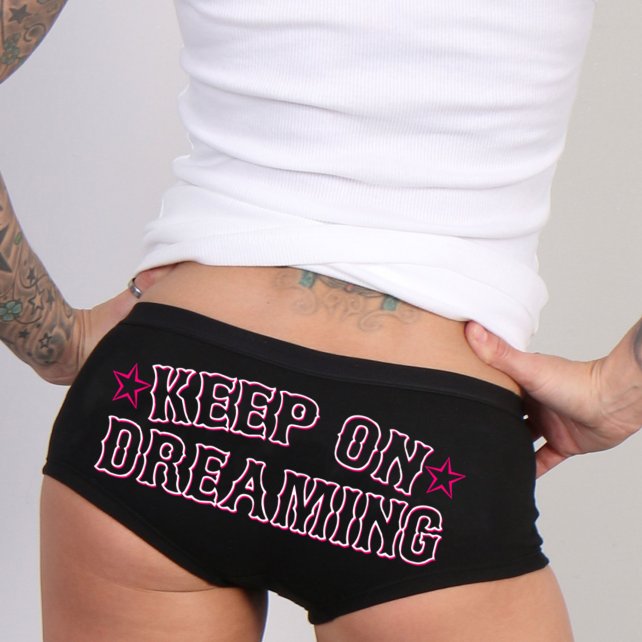 Pikkuhousut, Hot Leathers, Dreaming . Naisten pikkuhousut. Persuksen päälle painatettu teksti "Keep on dreaming". Pikkuhousujen materiaali 90 % puuvillaa ja 10 % spandeksia.