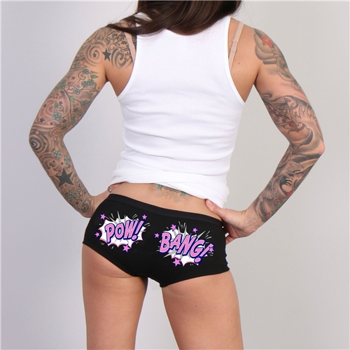 Naisten pikkuhousut, Pow Bang. Mustat pikkarit, jossa printti takana. Materiaali 90 % puuvilla, 10 % Spandex.