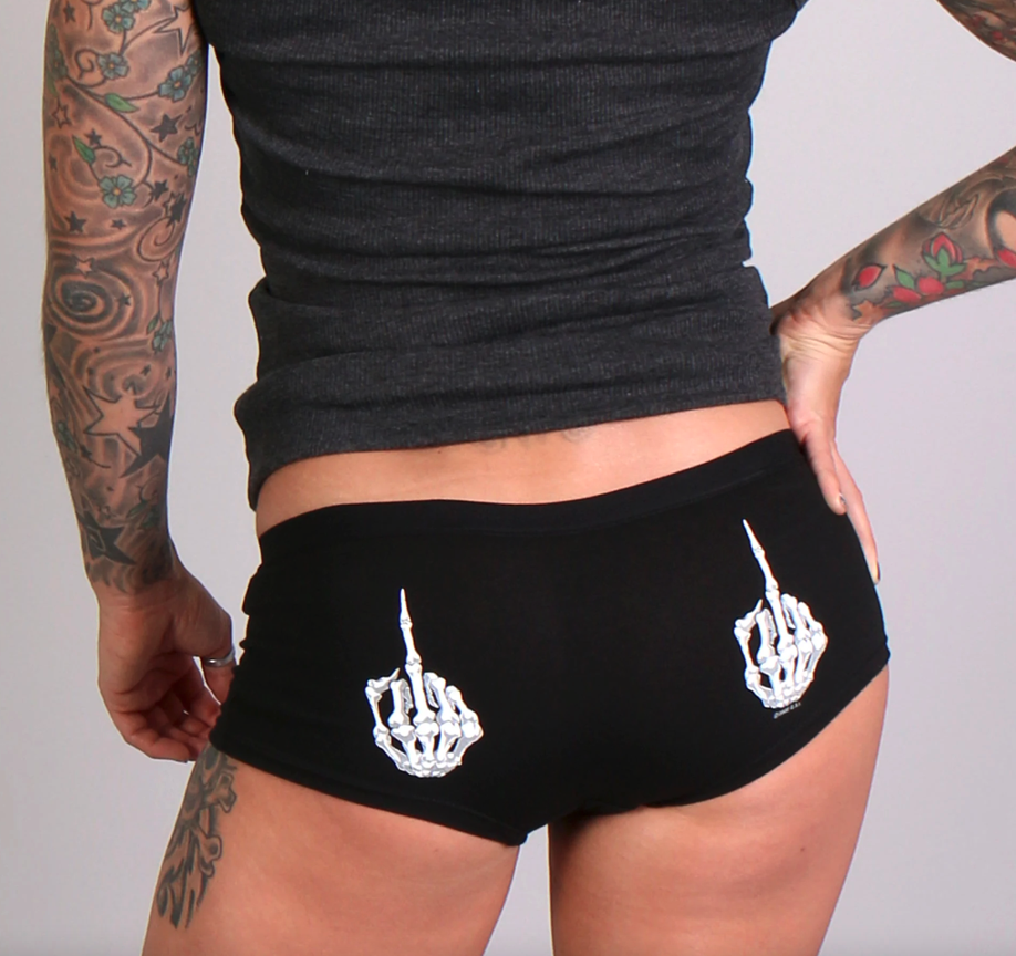 Naisten pikkuhousut. Persuksen päälle painatettu Luuranko centterit. Pikkuhousujen materiaali 90 % puuvillaa ja 10 % spandeksia.