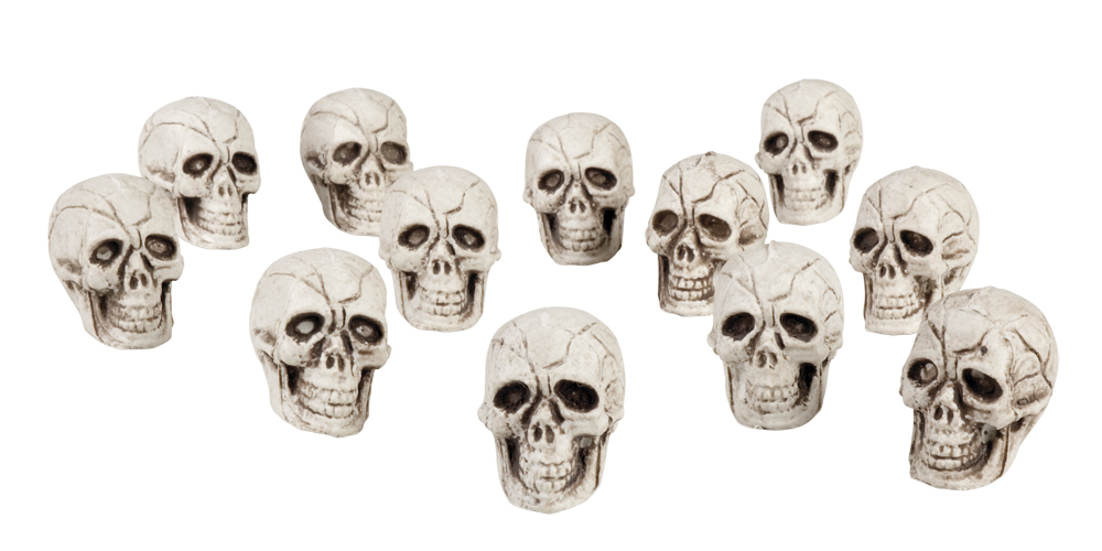 Pikkukallot verkkopussissa. 12 pientä muovikalloa (yhden kallon koko 4 x 3 cm) verkossa. Sirottele näitä pikku veijarikalloja tarjottimelle, puutarhaan, kattauksen somisteeksi tai mihin ikinä keksitkin.