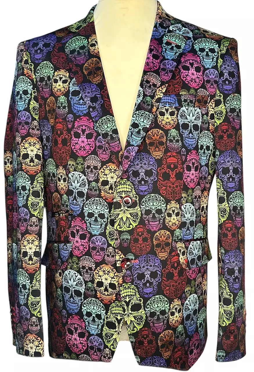 Pikkutakki Skull Print. Tyylikäs musta pikkutakki värikkäillä pääkalloilla. Laadukas puuvillainen, kiiltäväpintainen pikkutakki. Materiaali 97 % puuvillaa ja 3 % Lycraa. Slim fit- mitoitus. (HUOM pikkutakin taskut on harsittu kiinni, jotta tuote pysyy ryhdissään. Ratkotaan varovasti auki käyttöön otettaessa)