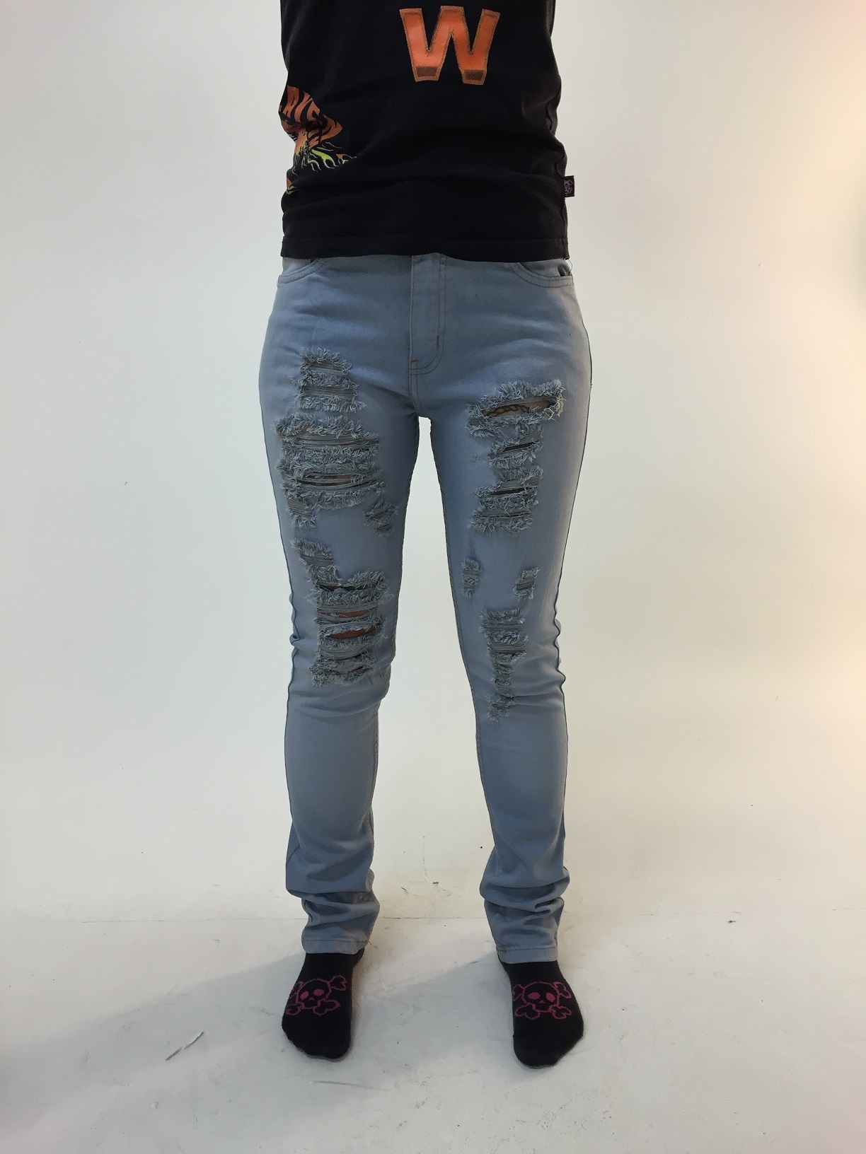 Pillifarkut, G-72, vaaleansininen. Naisten harmaat pillifarkut, jossa kulutusta lahkeiden etupuolella. 5-taskumalli. Vyölenkit. Tukevaa, mutta hyvin joustavaa farkkukangasta. Mukavat päällä.