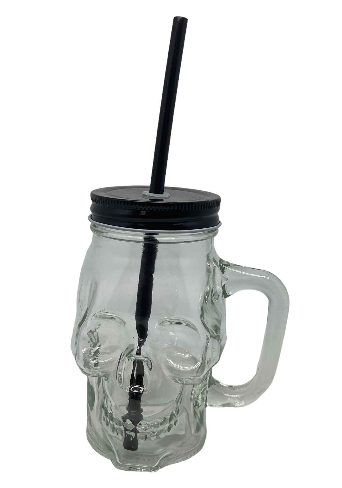 Pillimuki lasia, Pääkallo. Kirkaslasinen pääkallo muki, jossa musta, metallinen kansi ja pilli. Kannen saa auki kiertämällä. Lasin vetoisuus n. 500 ml.