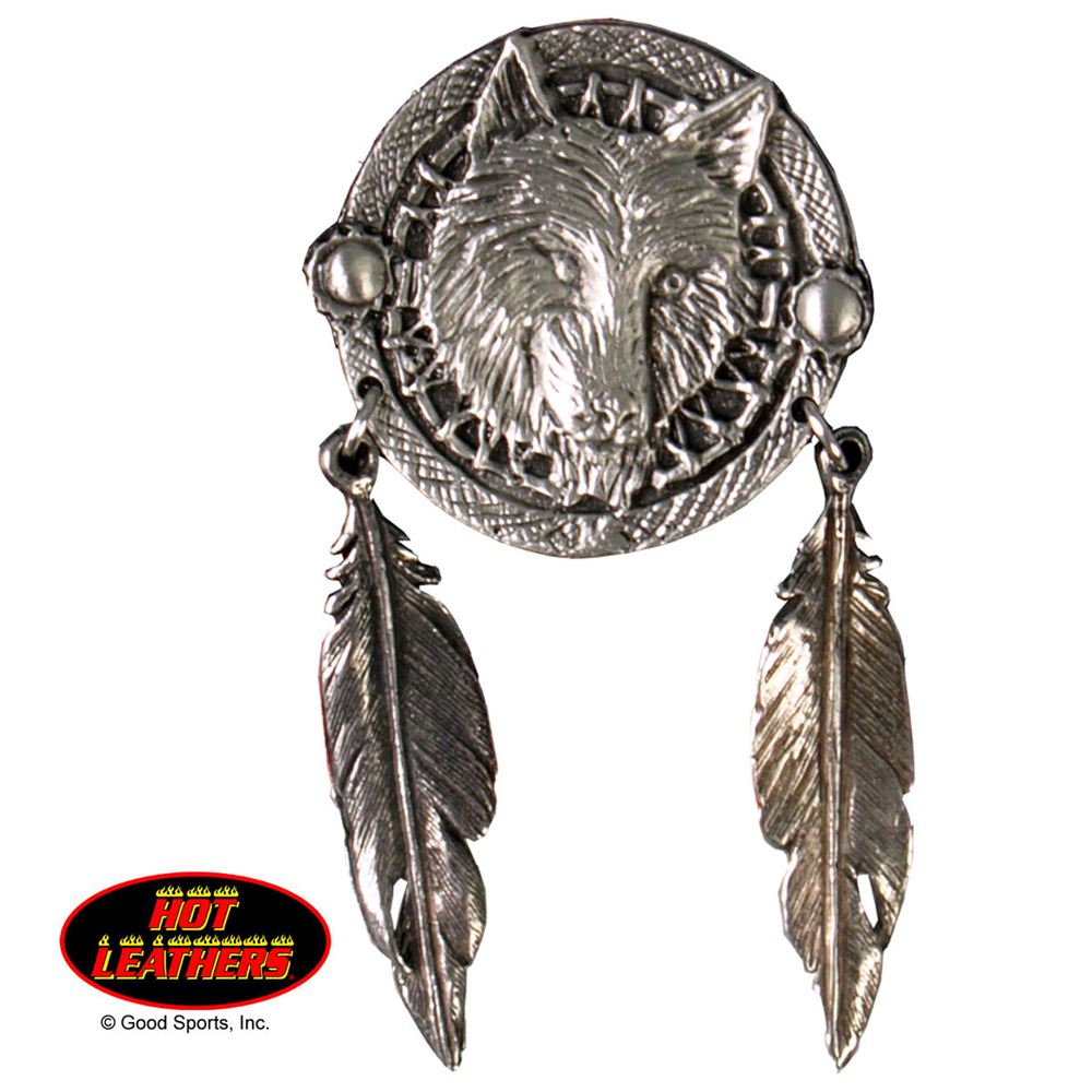 Pinssi, Hot Leathers, Wolf & Dream Catcher. Pinssin halk. n. 33 mm ja sulkakoristeen pituus siihen päälle vielä 38 mm.