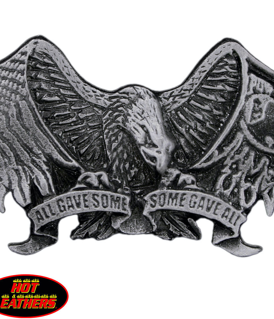 All Gave Some Heavy Pewter Biker Pin. Hand carved; lead free. Spread-wings eagle with POW/MIA shield and banner that reads "All Gave Some; Some Gave All".