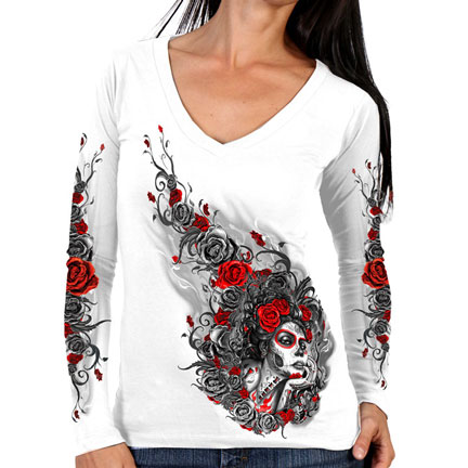 Pitkähihainen paita, Hot Leathers, Sugar Woman. Naisten valkoinen pitkähihainen paita syvällä V-kaula-aukolla. Materiaali 100 % puuvillaa. Painatukset rinnassa ja molemmissa hihoissa.