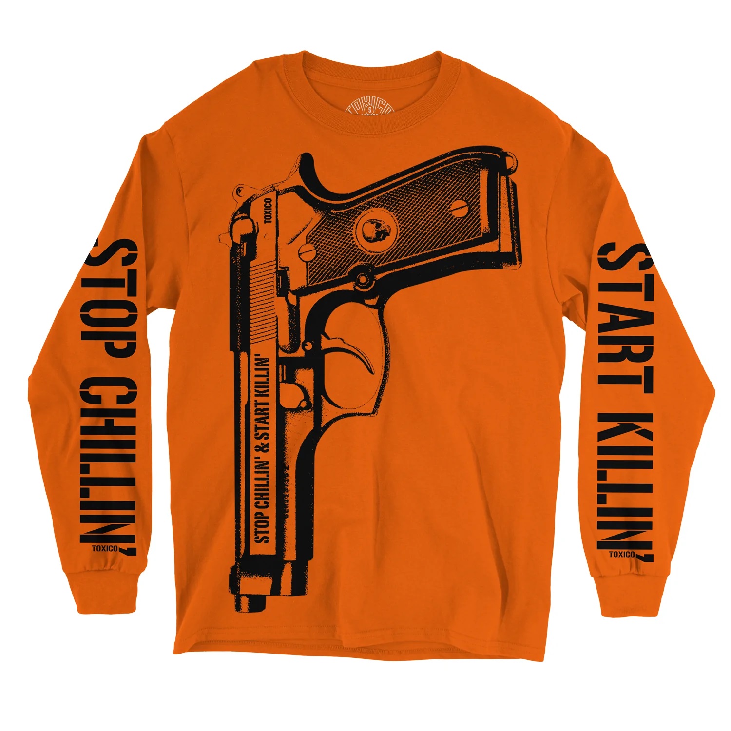 Pitkähiha Stop Chillin, oranssi. Näyttävä oranssi trikoopaita, jossa edessä ja molemmissa hihoissa isot printit. Materiaali esikutistettua puuvillatrikoota.