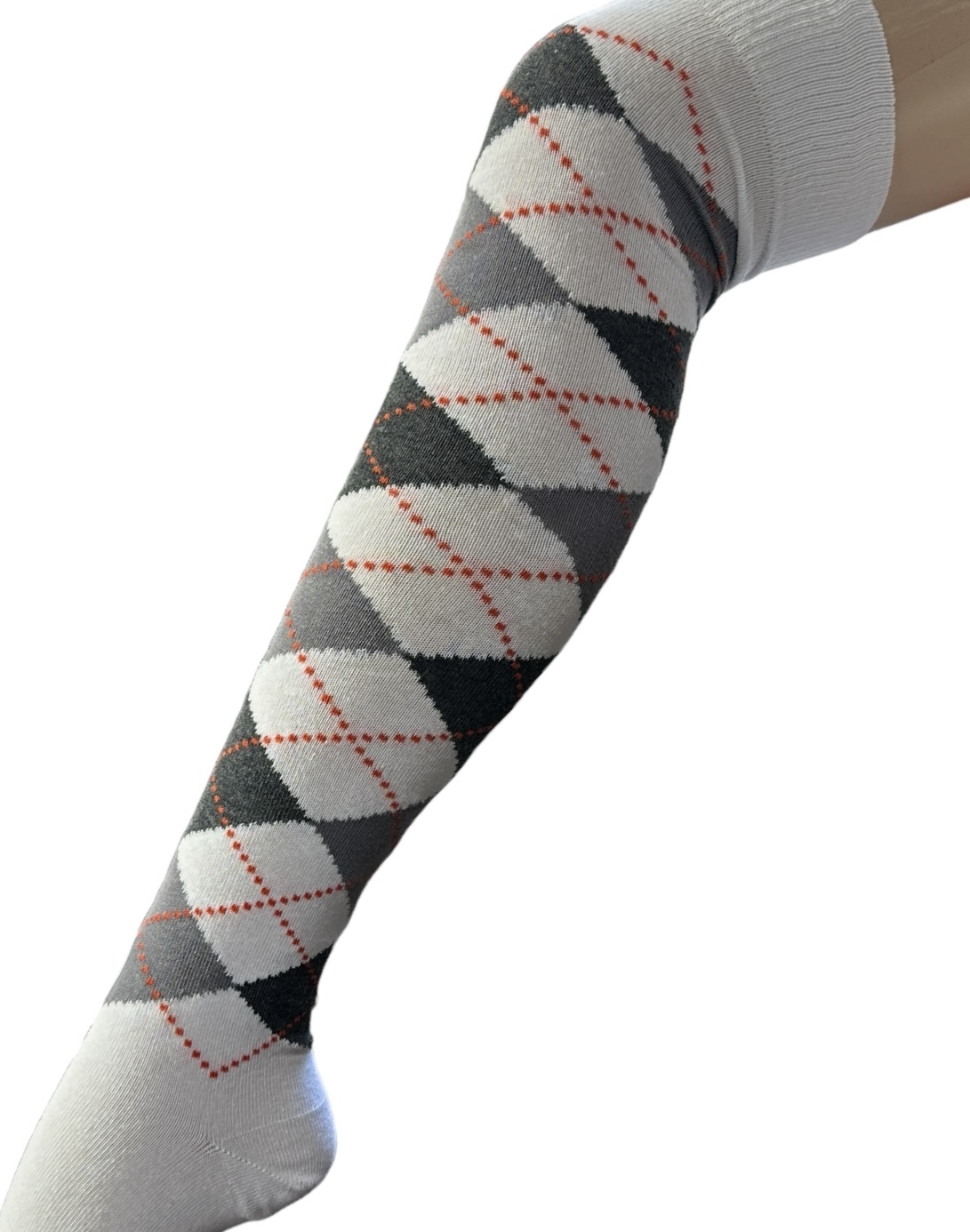 Pitkät sukat 38/41, Harmaa ruutu. Ruutukuvioiset pitkät valkoiset sukat. Sukan koko 38/41. Materiaali 80 % puuvillaa, 15 % polyamidia ja 5 % elastaania. HUOM ! Sukan pituus kantapäästä varren yläreunaan 50 cm venyttämättömänä. Mitta lyhenee säären ympäryksen mukaan.