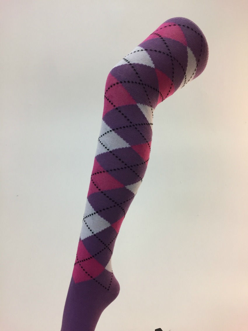 Pitkät sukat 38/41, Lila ruutu. Ruutu-kuvioidut pitkät sukat. Sukan koko 38/41. Materiaali 85 % puuvillaa, 13 % nylonia ja 2 % lycra elastaania.