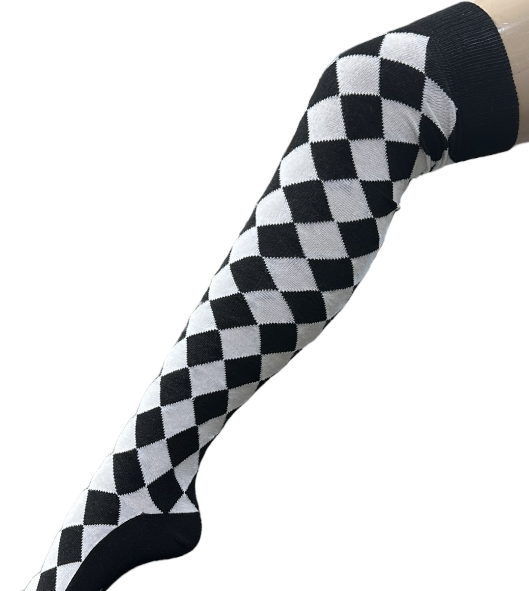 Pitkät sukat 38/41 Mustavalko salmiakki. Salmiakkiruutuiset pitkät sukat. Sukan koko 38/41. Materiaali 80 % puuvillaa, 15 % polyamidia ja 5 % elastaania. HUOM ! Sukan pituus kantapäästä varren yläreunaan 50 cm venyttämättömänä. Mitta lyhenee säären ympäryksen mukaan.