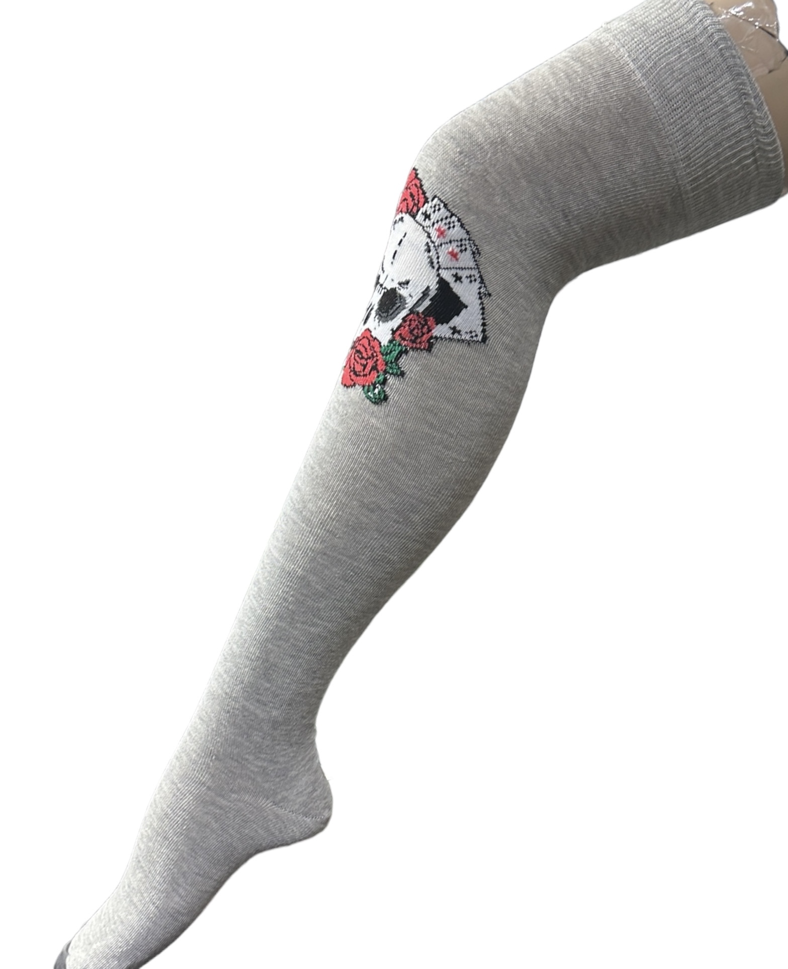 Pitkät sukat 38/41 Pokerikallo, harmaa. Vaaleanharmaat ylipolven sukat, joissa "Ruusukallo ja pelikortit" -kuva edessä. Sukan koko 38/41. Materiaali 80 % puuvilla, 15 % polyamidi ja 5 % elastaani. HUOM ! Sukan pituus kantapäästä varren yläreunaan n.50 cm venyttämättömänä. Mitta lyhenee säären ympäryksen mukaan.