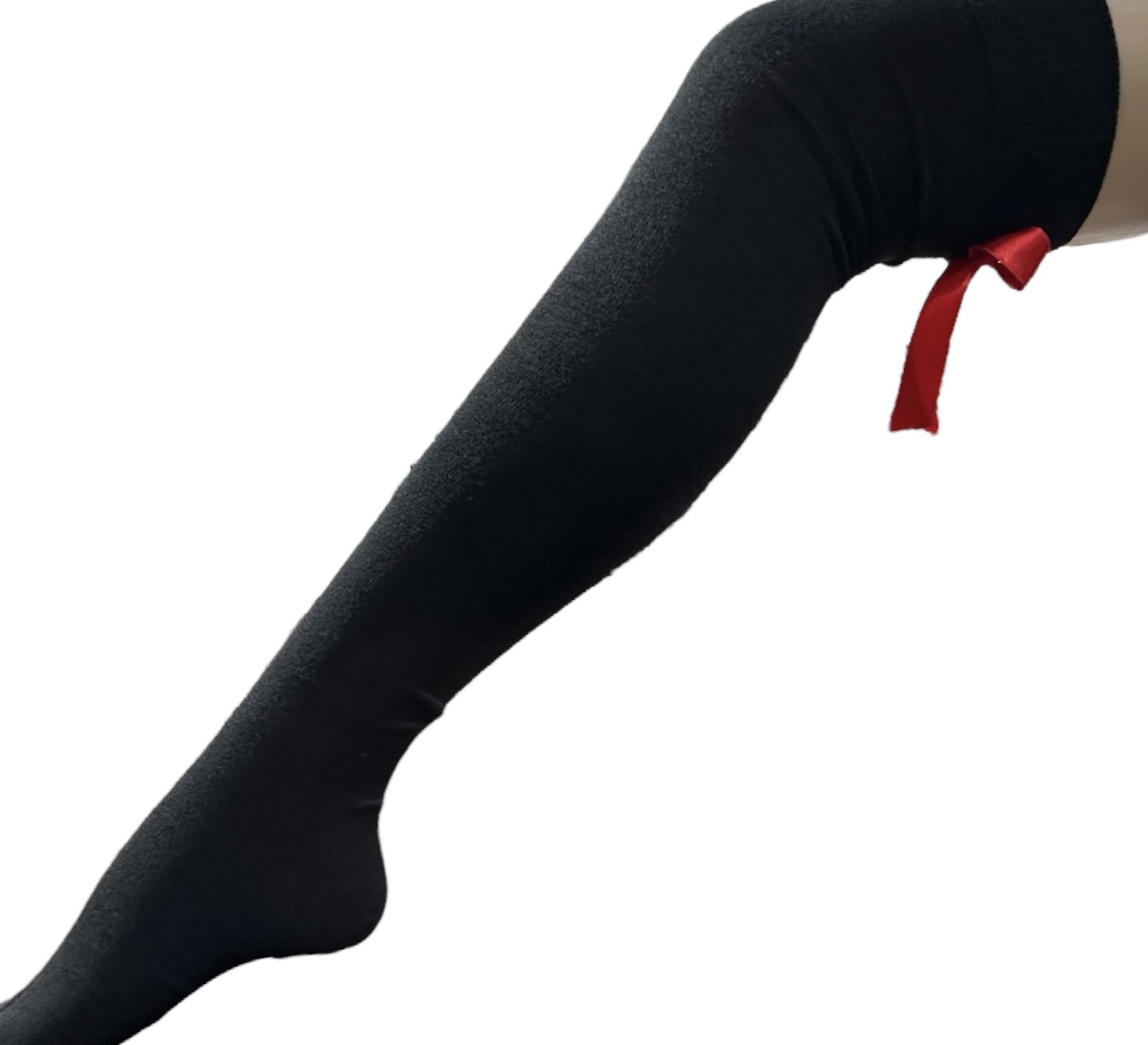 Pitkät sukat, 38/41, punaiset rusetit. Mustat ylipolven sukat, joissa iso punainen rusetti. Rusetti asettuu kauniisti takareiteen. Sukan koko 38/41. Materiaali 80 % puuvillaa, 15 % polyamidia ja 5 % elastaania.