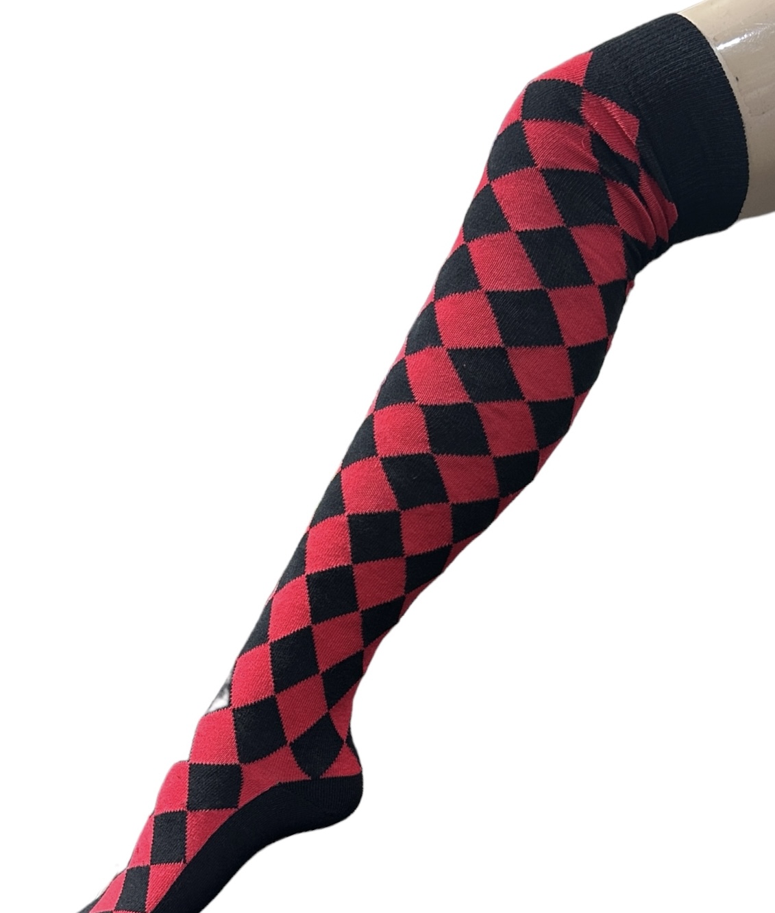 Pitkät sukat 38/41 Punamusta salmiakki. Salmiakkiruutuiset pitkät sukat. Sukan koko 38/41. Materiaali 80 % puuvillaa, 15 % polyamidia ja 5 % elastaania. HUOM ! Sukan pituus kantapäästä varren yläreunaan 50 cm venyttämättömänä. Mitta lyhenee säären ympäryksen mukaan.
