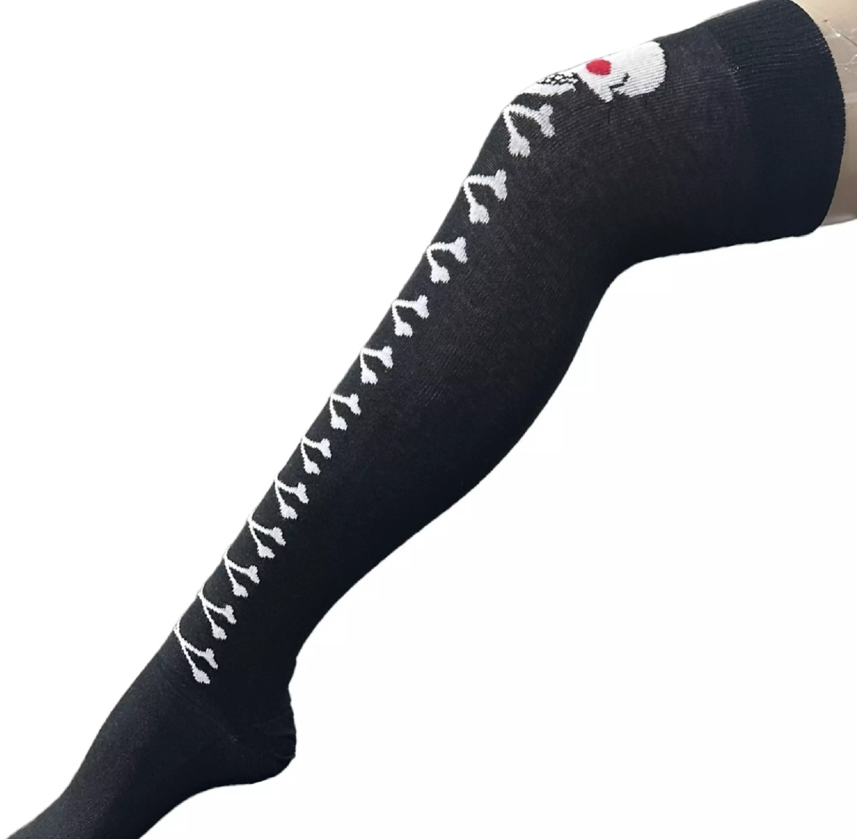 Pitkät sukat 38/41 Punasilmäkallo. Mustat ylipolven sukat, joissa punasilmäinen kallokuvio edessä. Sukan koko 38/41. Materiaali 80 % puuvilla, 15 % polyamidi ja 5 % elastaani. HUOM ! Sukan pituus kantapäästä varren yläreunaan n.50 cm venyttämättömänä. Mitta lyhenee säären ympäryksen mukaan.