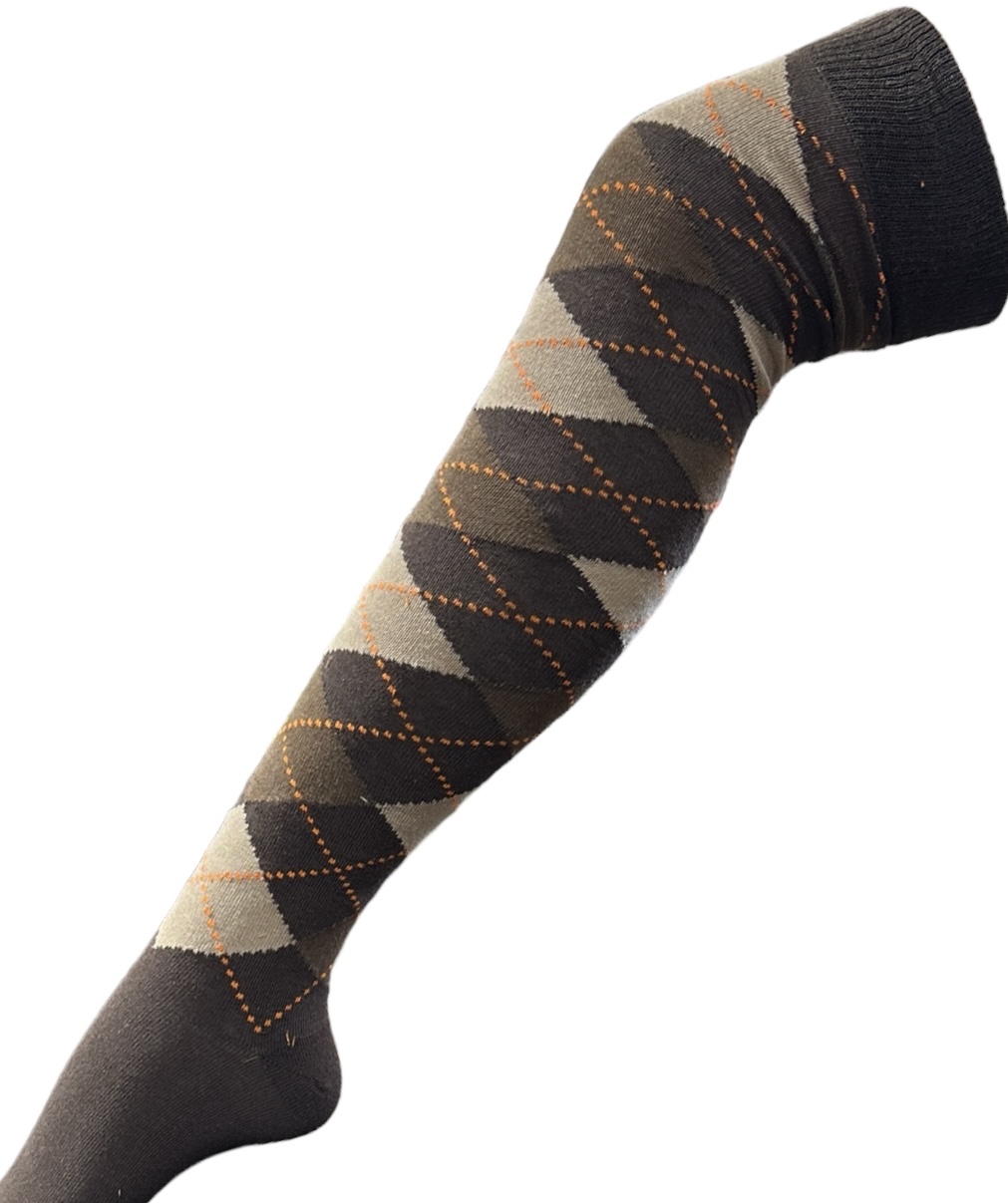 Pitkät sukat 38/41, Ruskea ruutu. Ruutukuvioiset pitkät sukat. Sukan koko 38/41. Materiaali 80 % puuvillaa, 15 % polyamidia ja 5 % elastaania. HUOM ! Sukan pituus kantapäästä varren yläreunaan 50 cm venyttämättömänä. Mitta lyhenee säären ympäryksen mukaan.