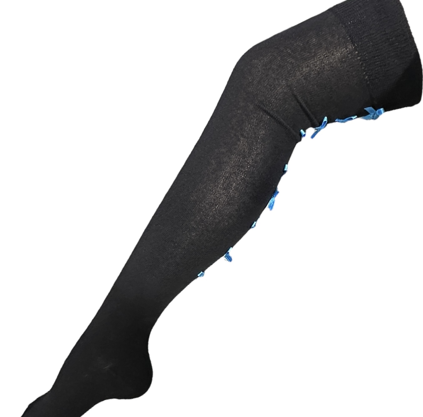 Pitkät sukat, 38/41, siniset pikku rusetit. Mustat ylipolven sukat, joissa pieniä sieviä sinisiä rusetteja säären takaosassa. Sukan koko 38/41. Materiaali 85 % puuvilla, 13 % nailon ja 2 % elastaani. HUOM! Sukan pituus kantapäästä varren yläreunaan n. 53 cm venyttämättömänä. Mitta lyhenee säären ympäryksen mukaan.
