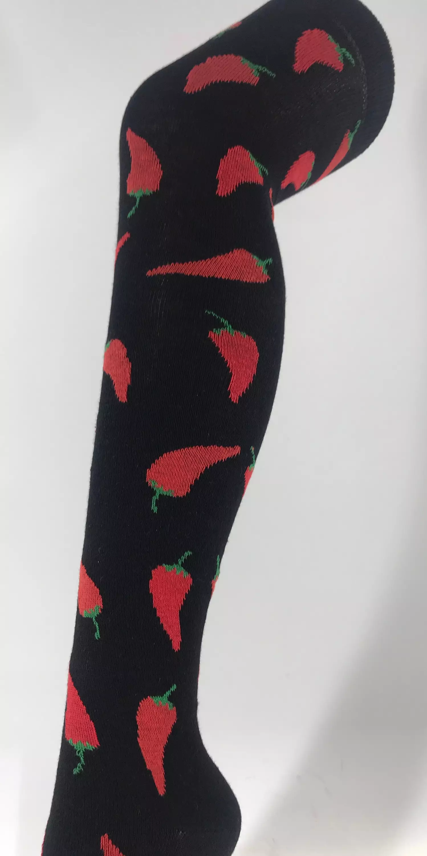 Pitkät sukat, Chili. Mustat ylipolven sukat, jossa chilikuvioita. Koko 38/41. Materiaali 85 % puuvillaa, 13 % nylonia ja 2 % Lycraa, hienopesu.
