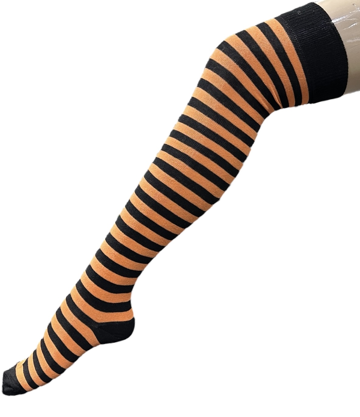 Pitkät sukat, koko 38/41, musta oranssi raidalliset. Oranssimusta vaakaraita. Sukka ylettyy polven yli. Sukan koko 38/41. Materiaali 80 % puuvillaa, 15 % polyamidia ja 5 % elastaania.