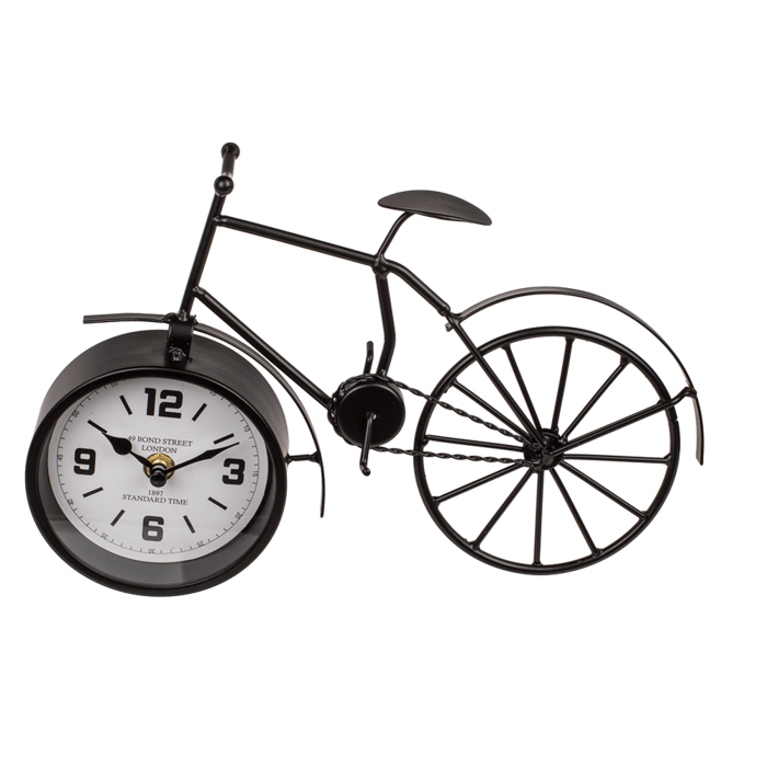 Pöytäkello Fillari, mustaa metallia. Mitat n. 31,5 x 6 x 20 cm. Kello toimii yhdellä AA-paristolla (ei sisälly pakkaukseen).