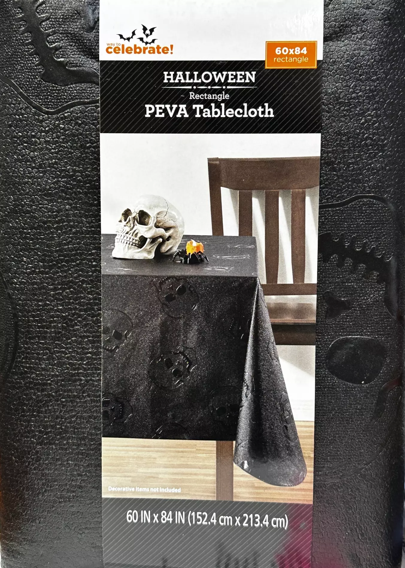 Pöytäliina Pääkallo n.152,4 x 213,4 cm, halloween. Musta PEVA-liina. Astetta kestävämpi "kertakäyttöliina". Tahrat voi pyyhkiä kostealla liinalla ja miedolla pesuaineella, joten liina saattaa kestää useammatkin kattaukset. Liinan materiaali PEVAa eli polyeteenivinyyliasetaattia, joka on klooriton, biohajoava materiaali.