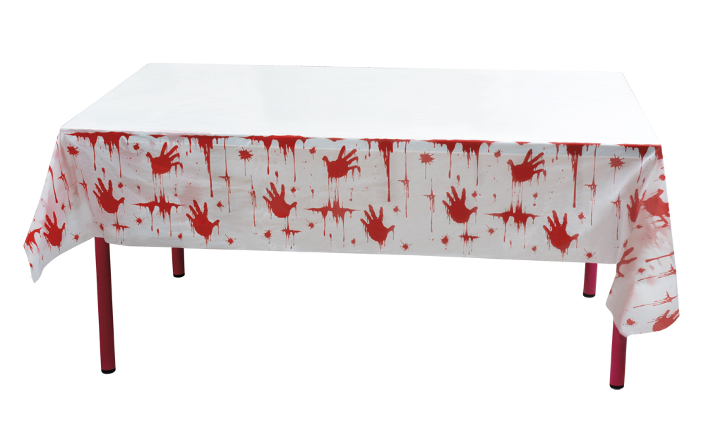 Pöytäliina, Veriset kädenjäljet. Materiaali muovia ja koko 135 cm x 275 cm.