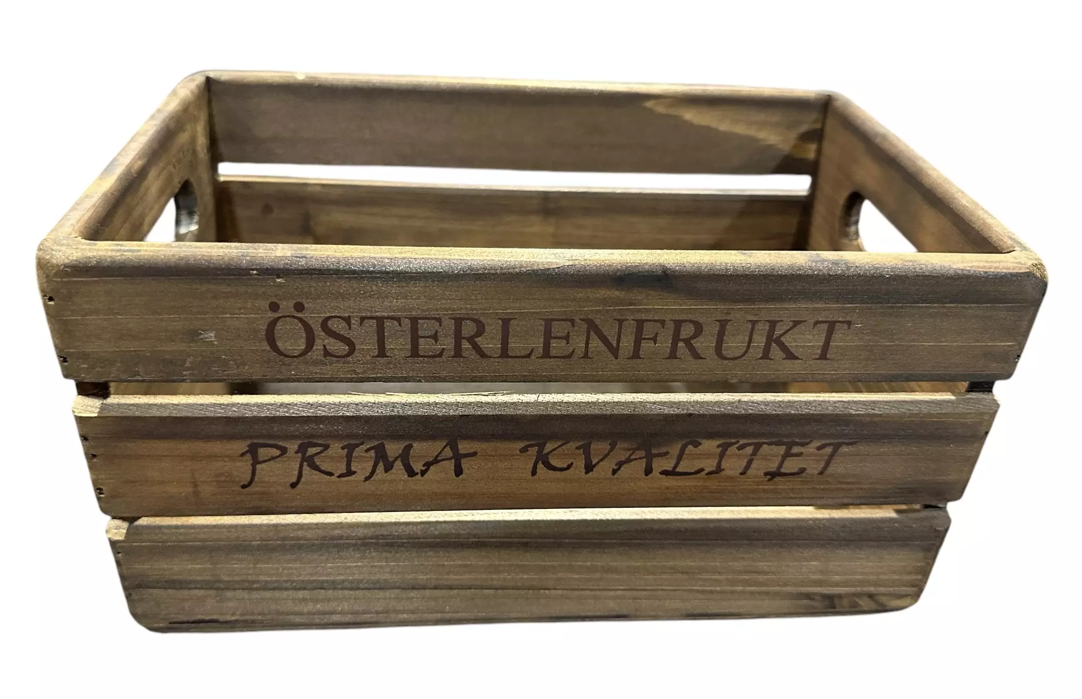 Puinen hedelmälaatikko S, ruskea. Laatikon mitat: 25,5 x 13 x 16 cm. Laatikkoa on saatavana kolmea eri kokoa.
