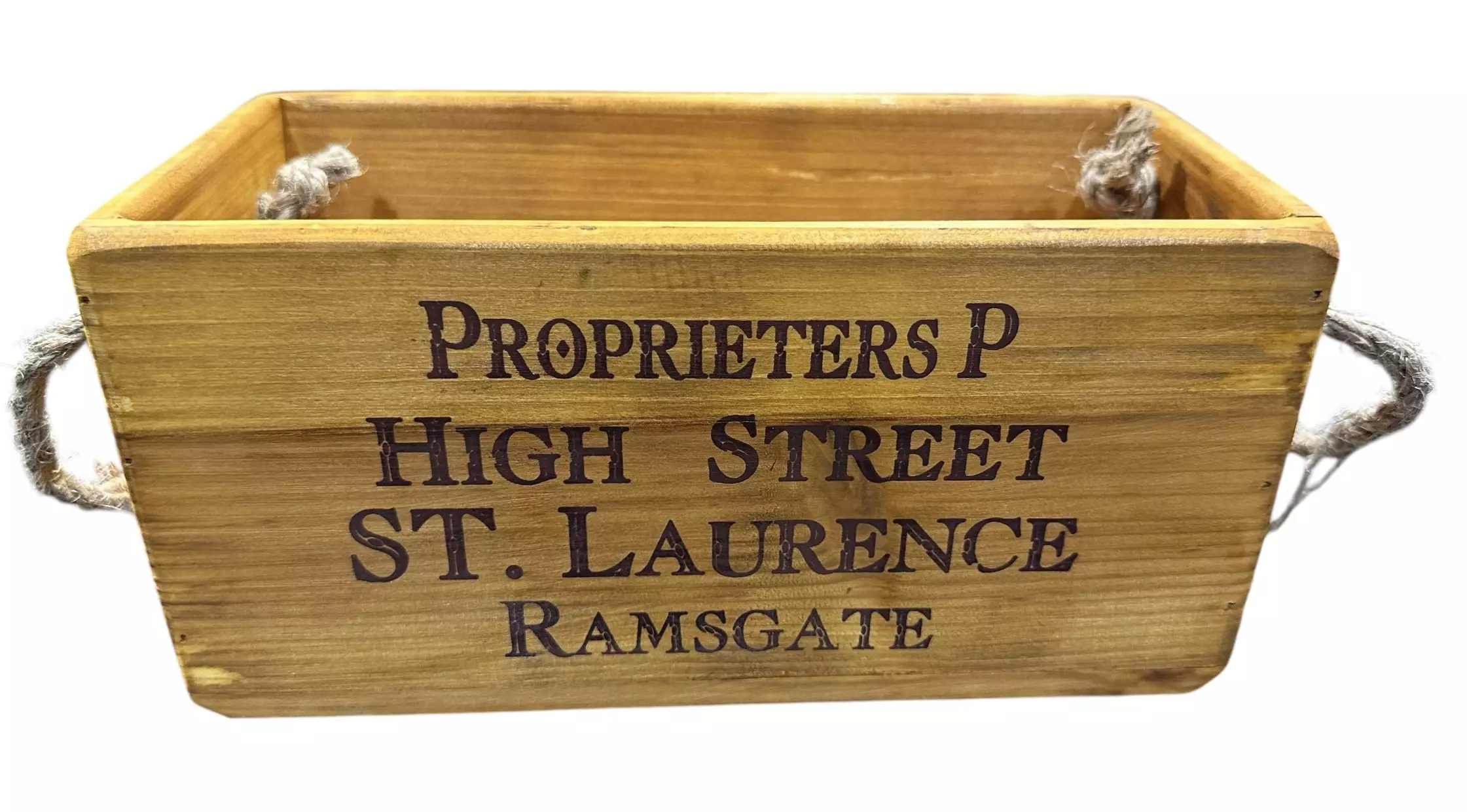 Puinen laatikko köysikahvoilla. S-Laatikon mitat 25 x 12 x 12 cm. Samaa sarjaa on saatavilla viittä eri kokoa.