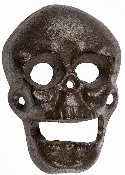Pääkallo pullon avaaja valurautaa, painava ja tukeva. noin 10-cm korkea.