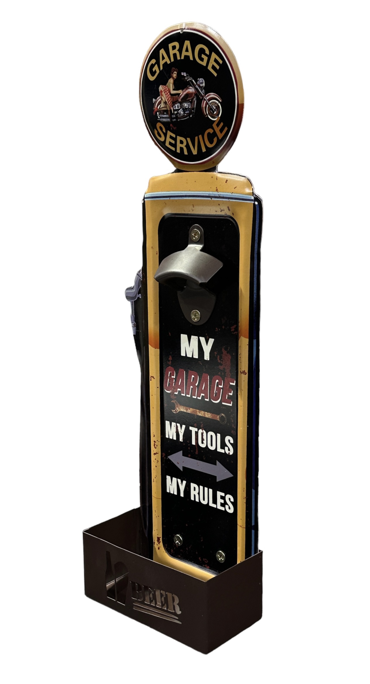 Pullonavaaja Seinälle Garage Service. Peltisen avaajan mitat 14,5 x 48 cm x 7,5 cm.