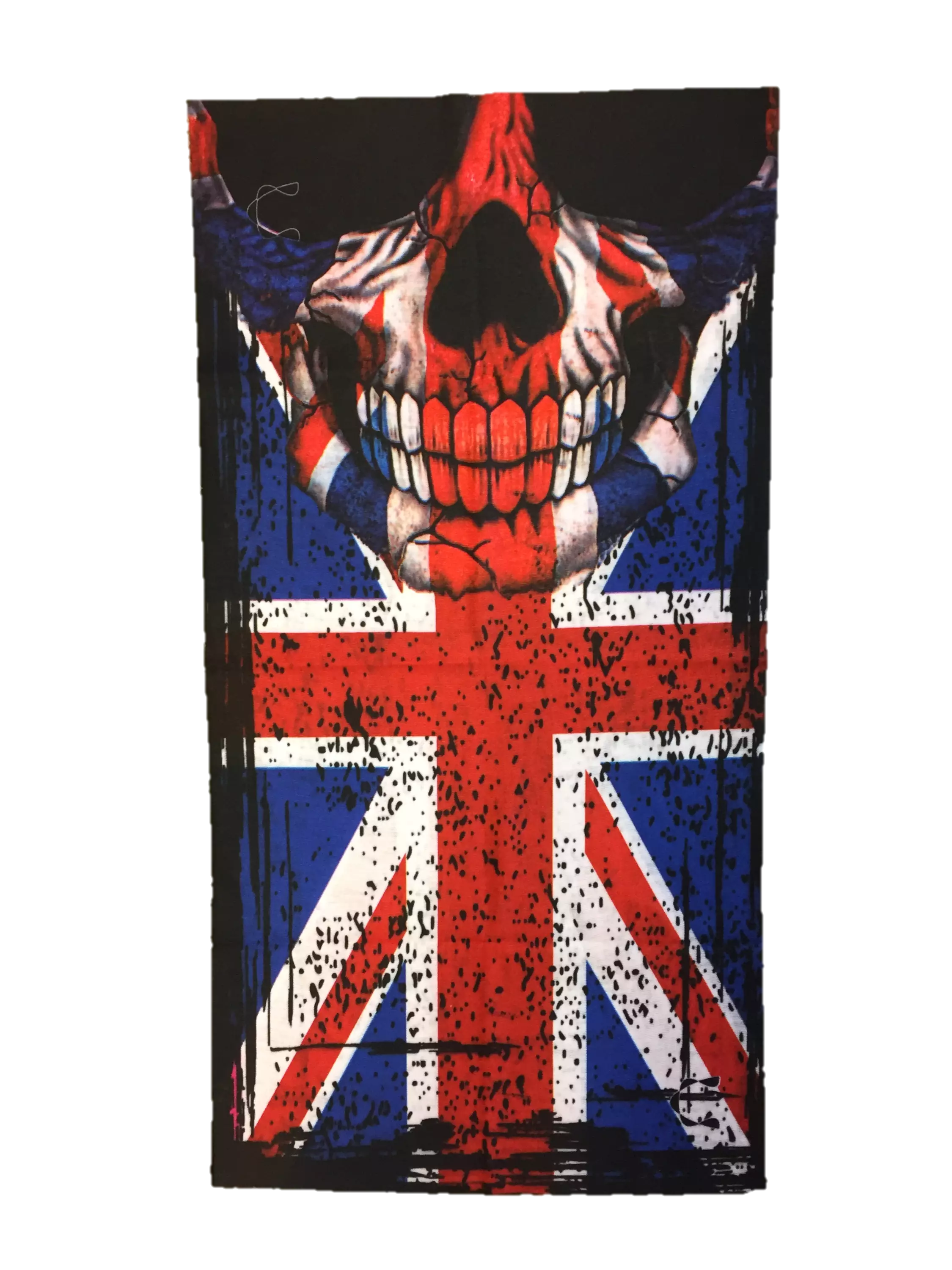 Putkihuivi, Brittililippu ja kallo, on monikäyttöinen ja myötäilevä asuste. Voidaan käyttää mm. kaulahuivina, pipona, otsapantana ja toppina. Erinomainen myös moottoripyöräily varustuksena. Materiaali 100 % polyesteria, pesu 40 asteessa.