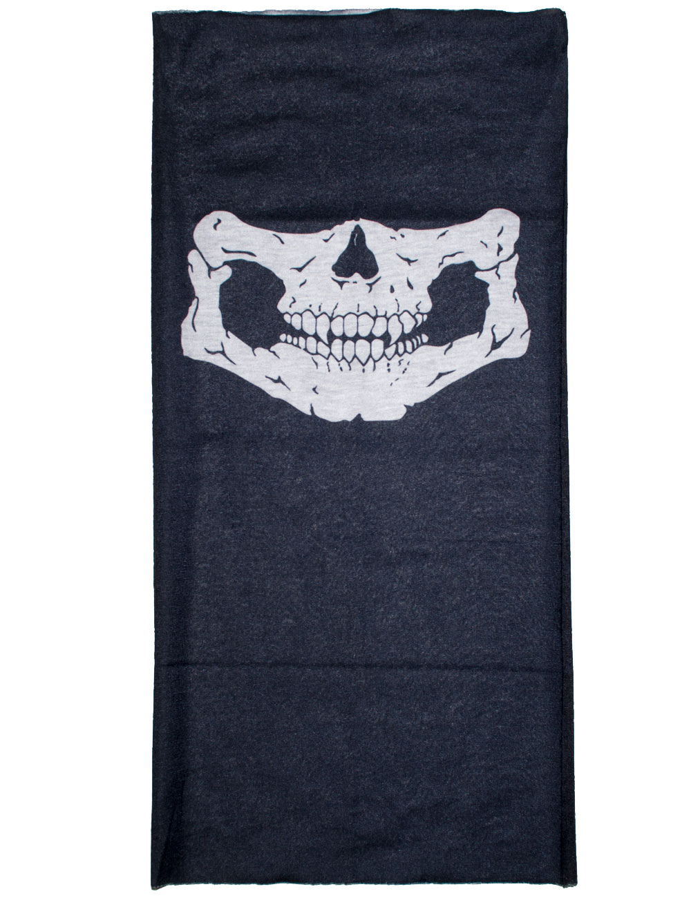 Putkihuivi, musta, skull face, on monikäyttöinen ja myötäilevä asuste. Voidaan käyttää mm. kaulahuivina, pipona, otsapantana ja toppina. Erinomainen myös moottoripyöräily varustuksena. Materiaali 100 % polyesteria, pesu 40 asteessa.