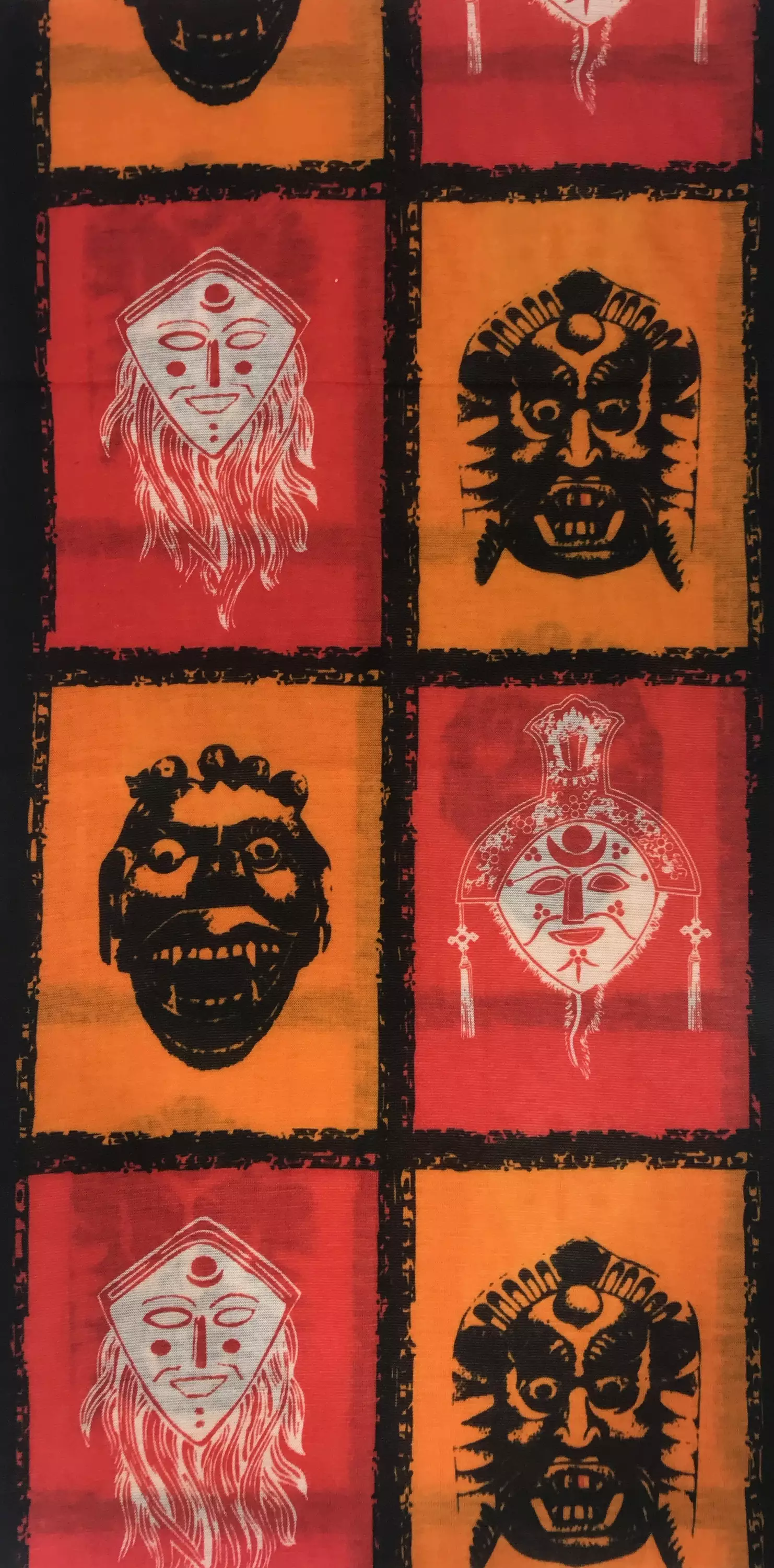 Putkihuivi, toteemihahmot. Oranssipunaruutuisella pohjalla mustia ja valkoisia toteemihahmoja. Putkihuivi on monikäyttöinen ja myötäilevä asuste. Voidaan käyttää mm. kaulahuivina, pipona, otsapantana ja toppina. Erinomainen myös moottoripyöräilyvarustuksena. Materiaali 100 % polyesteria, pesu 40 asteessa.