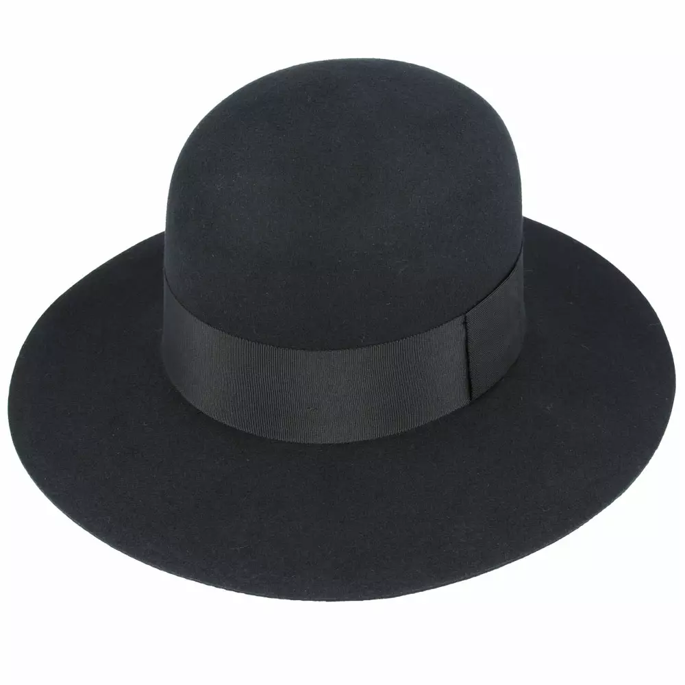 Pyöreäkupuinen huopahattu, 100 % villaa. Vuoriton hattu, hattunauha sisäpuolella puuvillaa. Hattukupu 14 cm ja lierin leveys 9 cm.