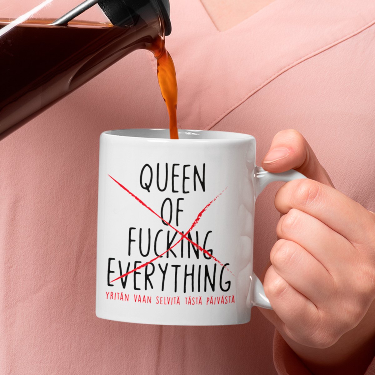 Q niinkuin Quningatar, kahvikuppi. Vertaistukimuki. Kaksipuoleisella painatuksella, valkoinen muki. Vetoisuus 330 ml.