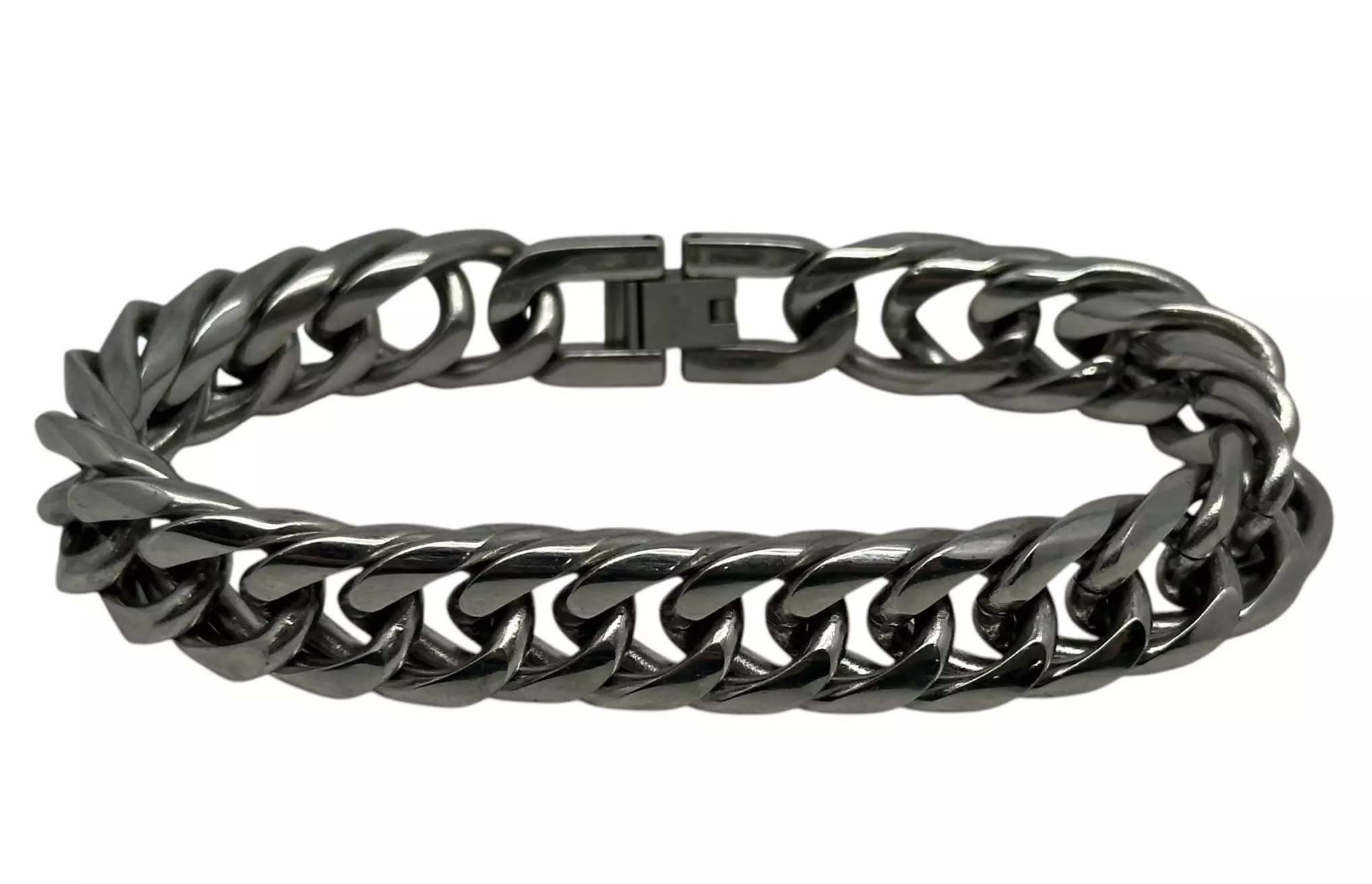 Ranneketju 13 mm, ruostumaton teräs. Ketju on hiottua ruostumatonta terästä, nikkelivapaa. Ketjun pituus suorana n. 21 cm, ketjun leveys 12 mm ja paksuus vajaa 6 mm.
