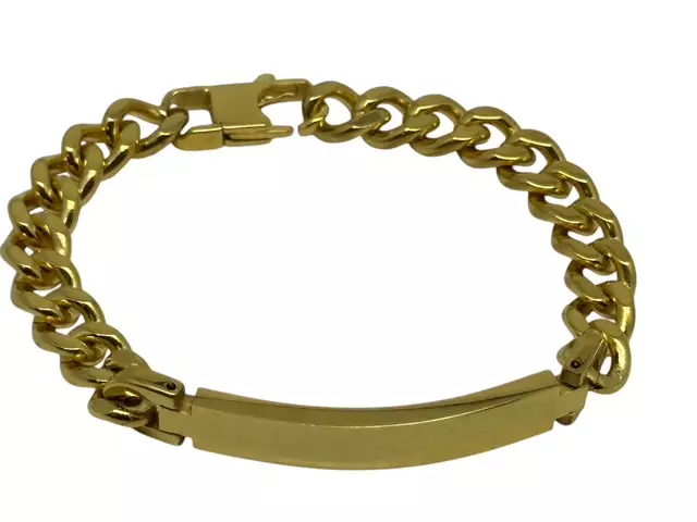 Ranneketju laatalla, kullanvärinen. Ketjun lev.9 mm, paksuus 3 mm, laattaosan pituus n. 5 cm ja ketjun kokonaispituus 21 cm. Ketju on ionipinnoitettua, ruostumatonta terästä, nikkelivapaa.