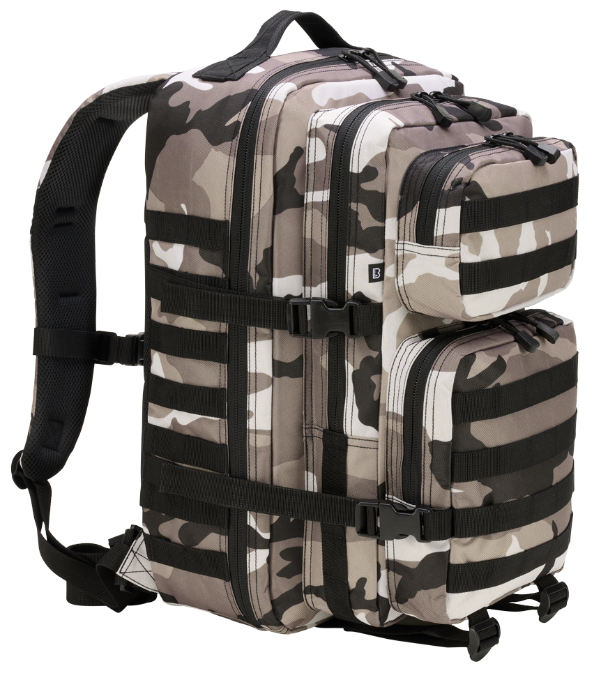 Reppu Brandit Urban Large US Cooper. Mitat 50 x 30 x 32 cm, tilavuus n. 40 litraa. Pehmustetut olkahihnat ja selkäosa. Paljon taskuja, ripustuslenkkejä ja remmejä, jotka helpottavat pakkaamista ja lisäävät toimivuutta sekä käytännöllisyyttä.