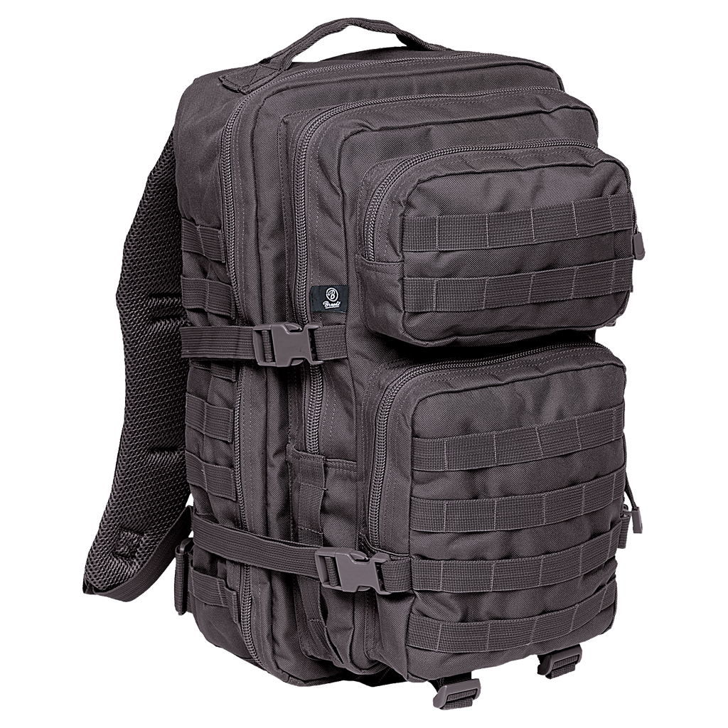 Reppu, Brandit, US Cooper Large, musta. Vedenpitävää kangasta. Repussa on kaksi erillistä ns. pääosastoa. Kaikissa tärkeimmissä taskuissa on kaksisuuntainen vetoketju. Säädettävät pehmustetut olkaimet sekä säädettävä ja irroitettava lantiovyö. Repun ulkoiset mitat 52x30x32 cm. Tilavuus 40 litraa.