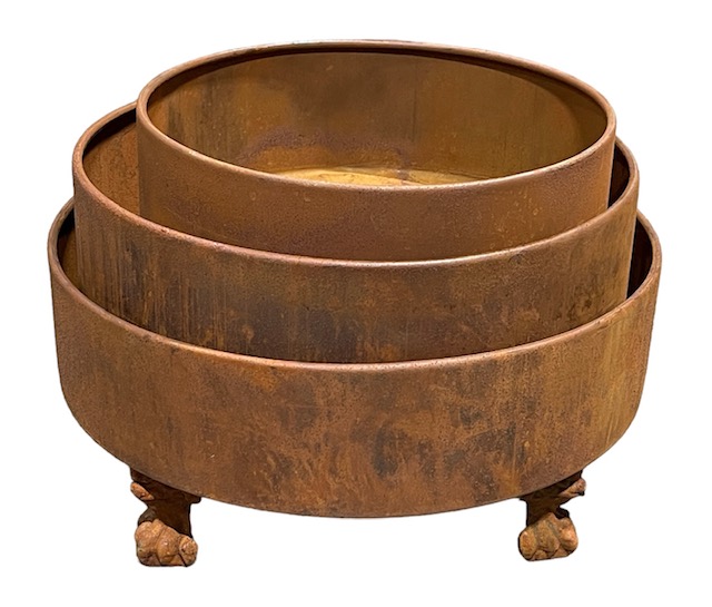 Ruosteen patinoima jalallinen vati. Meiltä saatavilla kolmea eri kokoa. Tämä ROST13 on isoin koko. Halkaisija 38 cm, korkeus jalkoineen 17 cm, vadin reuna 10 cm korkea. Pyöreän vadin alla kolme tassun näköistä jalkaa. Soveltuu parhaiten ulos, tuotteesta saattaa varista irtoruostetta.